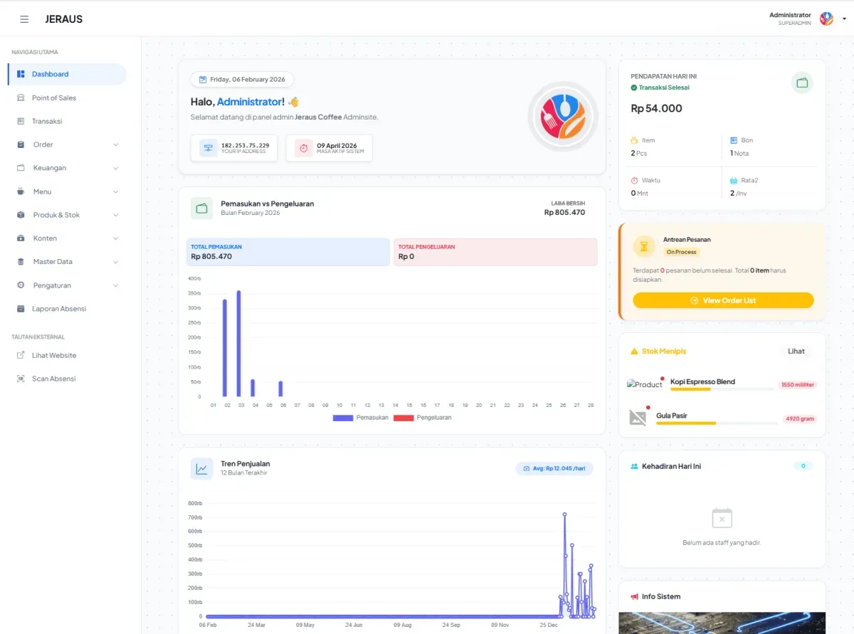 Jeraus POS terintegrasi website bisnis, dengan laporan keuangan, inventori, pantau pesanan, menu online, struk digital, multi user, absensi dan sistem afiliasi.